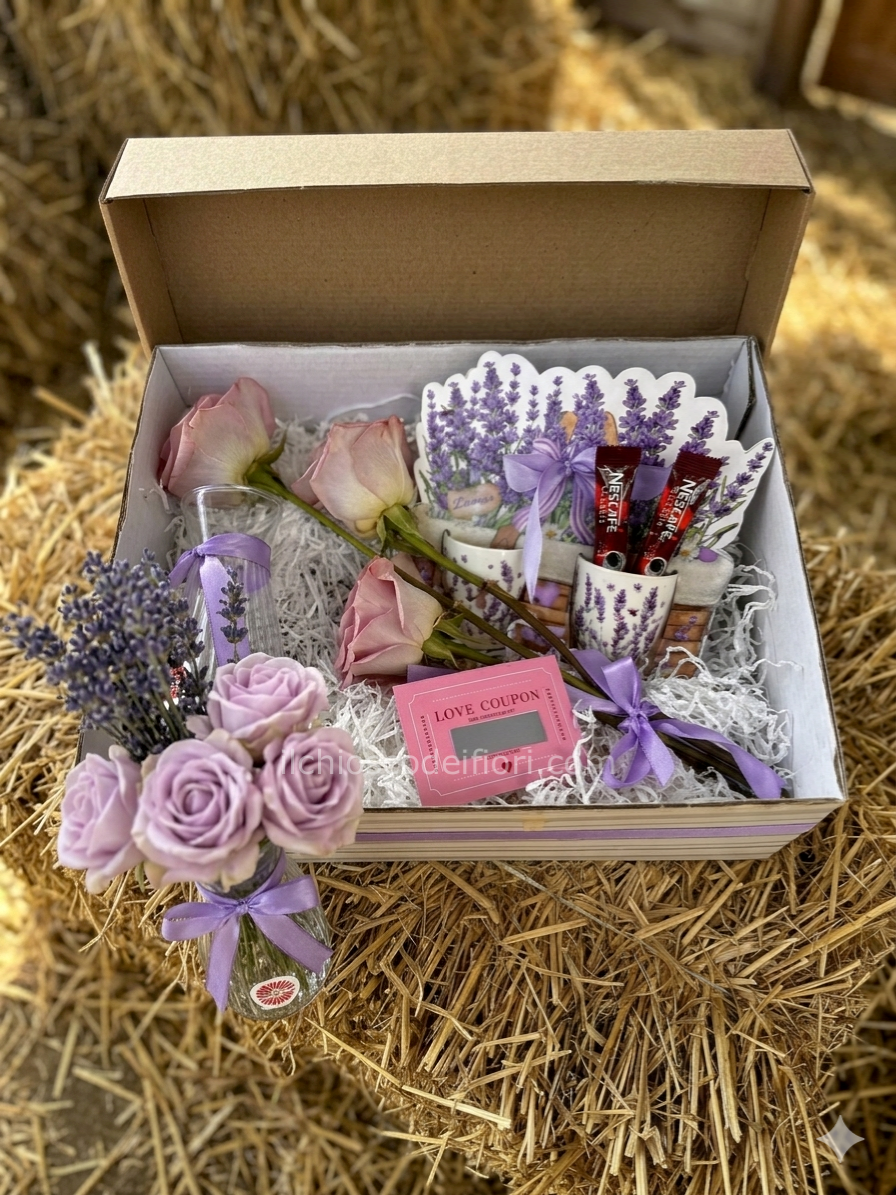 All’interno troverete un grazioso vasetto con fiori, eleganti rose, due tazzine da caffè per condividere attimi speciali e un romantico biglietto “gratta e vinci” che renderà il regalo ancora più emozionante.