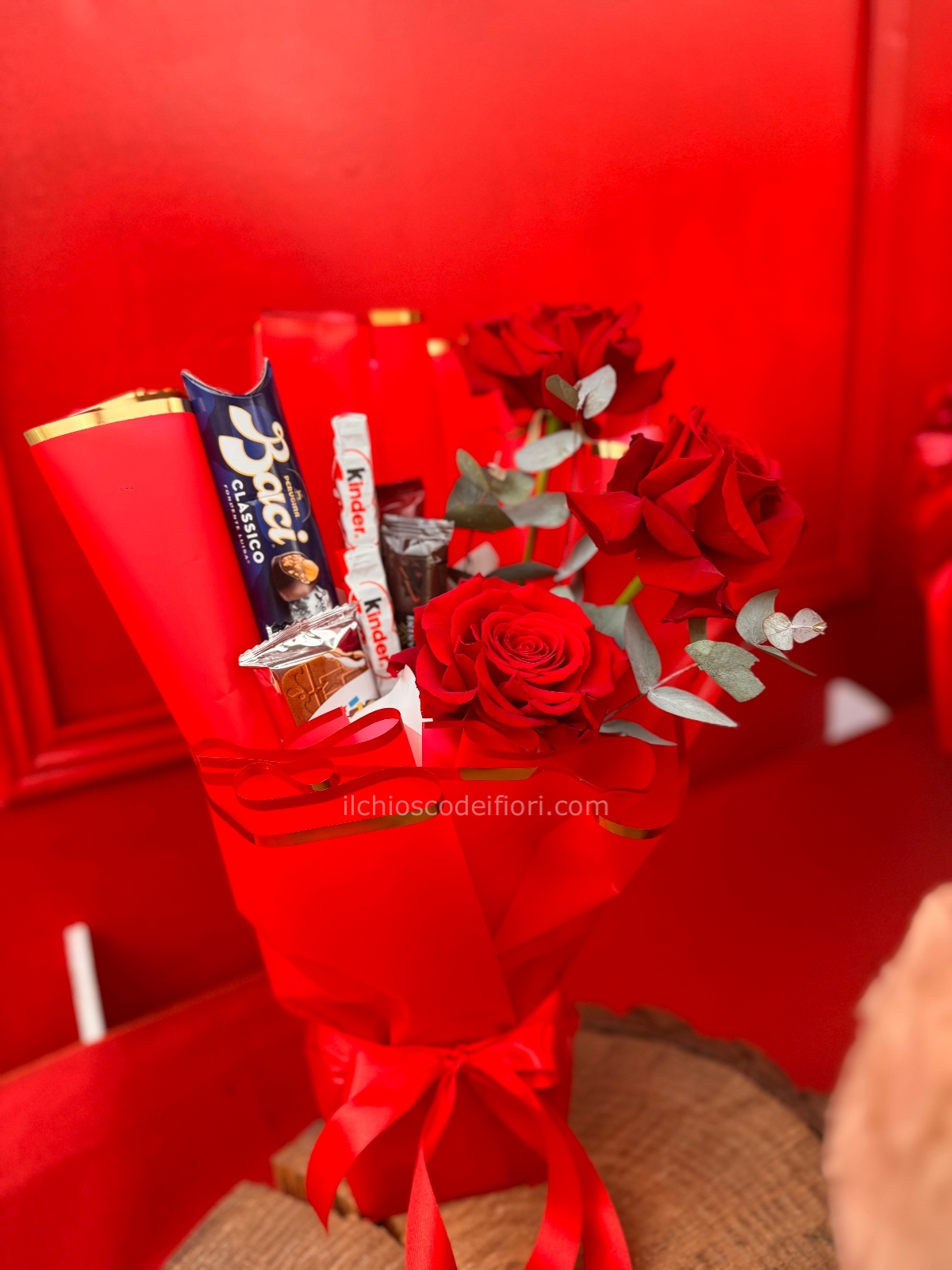 | Composizione con rose e cioccolattini assortiti cod. 124143 | Importo € 25,00 | Num. steli : |